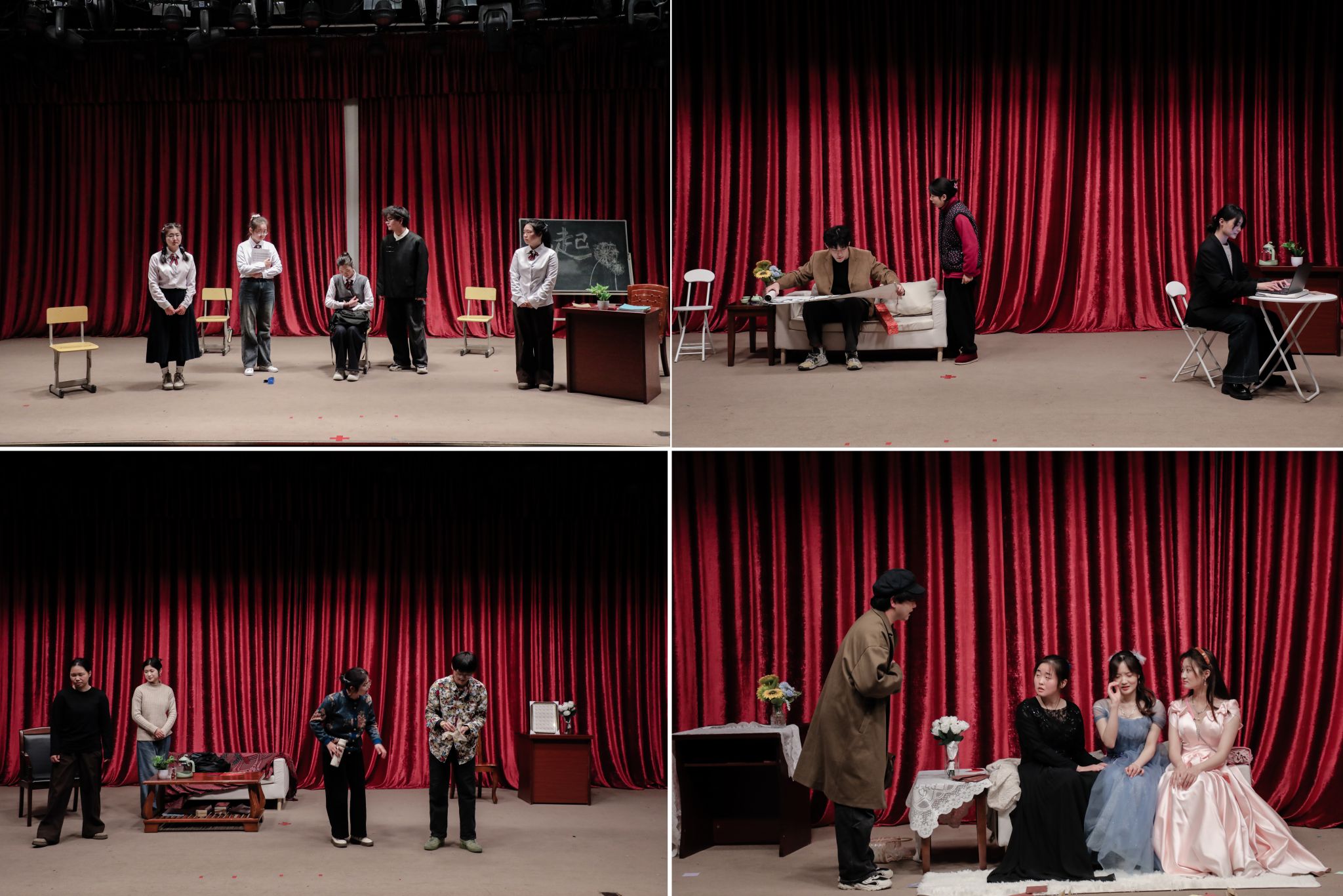 全班同学被分成四个小组,分别表演原创独幕剧《风起蒲公英》《面子和票子》《一念之差》,以及改编剧目《主角登场》。