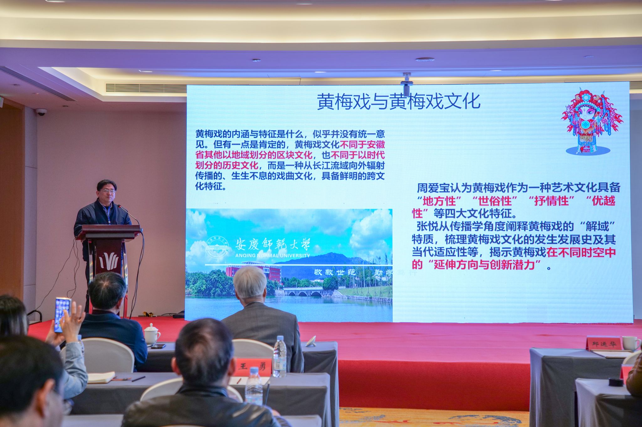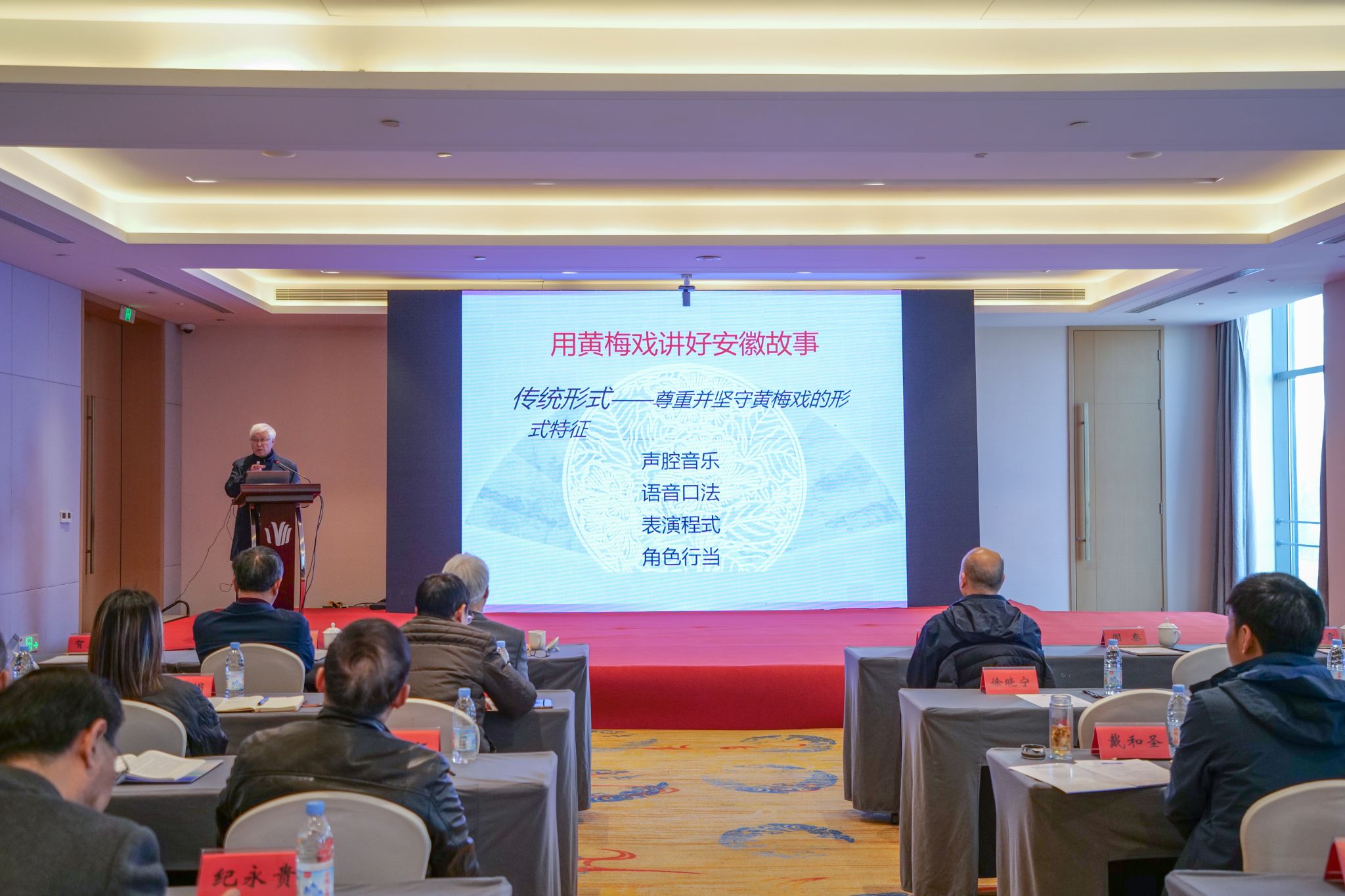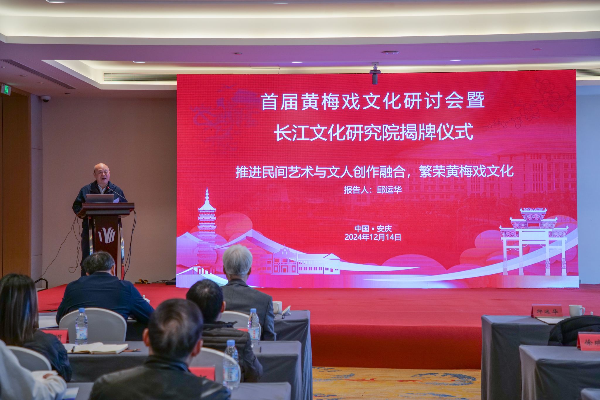 首都师范大学原副董事长邱运华教授,苏州大学周秦教授,文化和旅游部民族民间文艺发展中心朱飞跃研究员,安徽省人民政府参事、安徽大学刘伯山教授、公司叶当前教授围绕黄梅戏文化理论的探索与建构作了主旨报告。公司二级教授方锡球、安徽艺术研究院一级编剧沈梅主持报告会。